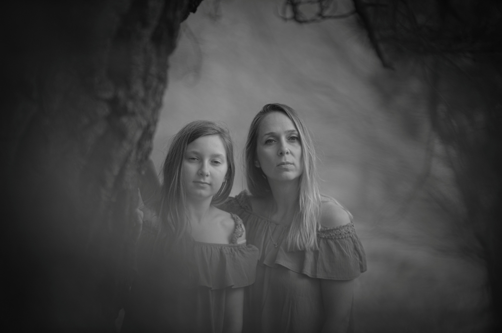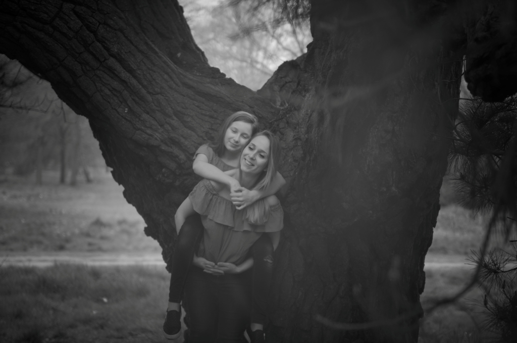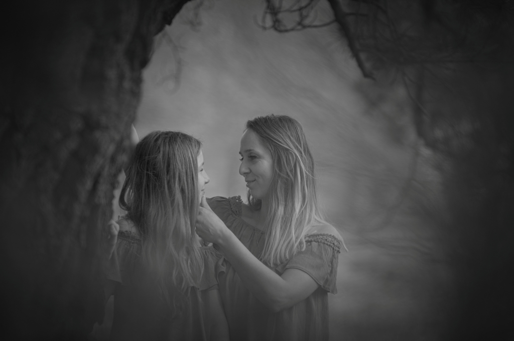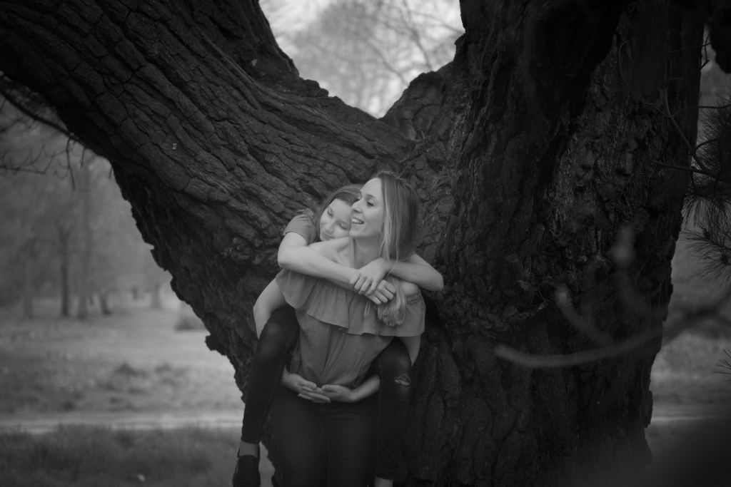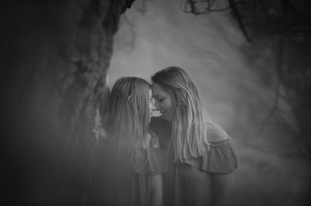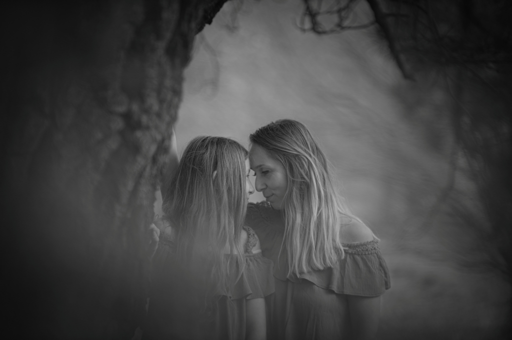 Mother and daughter photoshoot in the front of our camera. This kind a photo session is often just a moment effect. Choosing a different place and other ways of graphic processing, we can create a quite original way of photo presenting. From flowers and greenery, to gray and black is a short way.